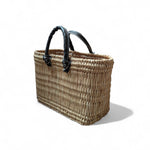 This reed storage basket is handwoven from durable natural palm leaves and finished with sturdy black leather handles, making it both practical and stylish. Perfect for use as a market tote, picnic basket, storage bin, or eco-friendly shopping bag, it combines traditional Moroccan craftsmanship with modern functionality.