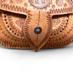 Immerse your customers in the rich heritage of Moroccan craftsmanship with our authentic hand-tooled leather saddle bag. This exquisite piece is a true work of art, featuring an incredibly intricate arabesque and geometric pattern meticulously carved and embossed across the entire front flap and body. The warm, rich tan leather provides the perfect canvas for this detailed artistry, often featuring a traditional central motif (like a camel or geometric emblem), making each bag uniquely captivating.